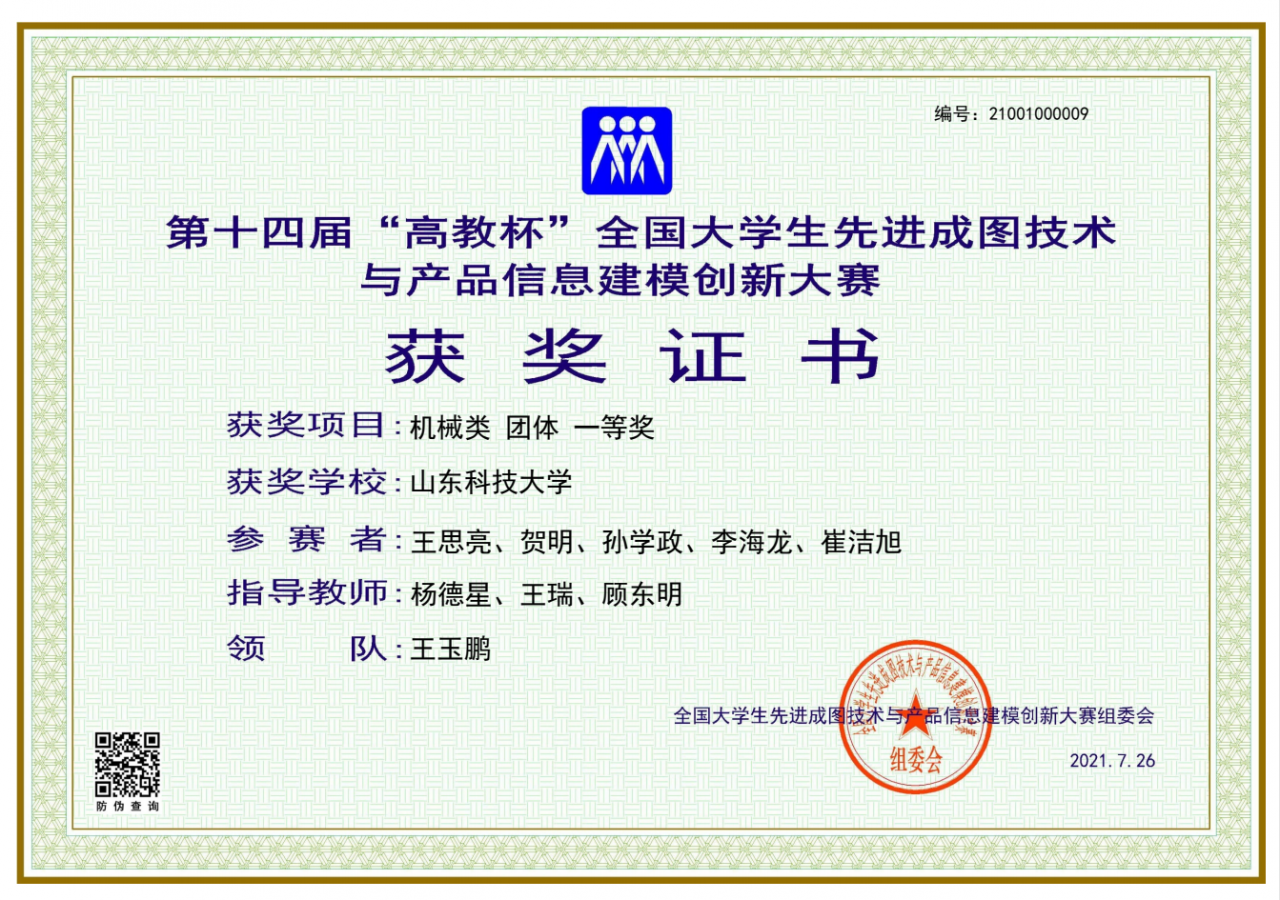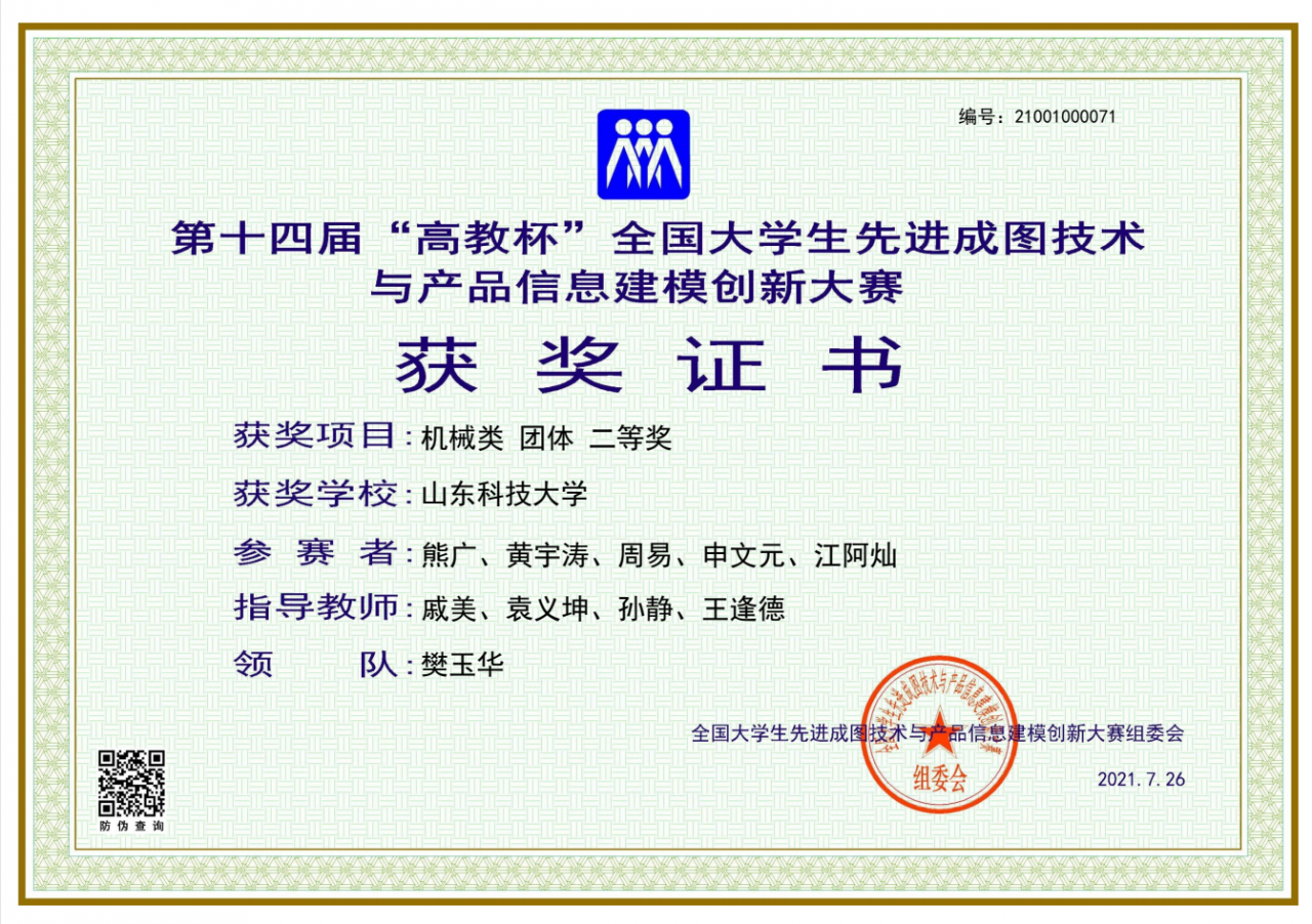 点击:近日,由全国大学生先进成图技术与产品信息建模创新大赛组委会、中国图学学会制图技术专业委员会、中国图学学会产品信息建模专业委员会、西南交通大学共同主办的第十四届“高教杯”全国大学生先进成图技术与产品信息建模创新大赛在西南交通大学顺利落下帷幕。经过激烈角逐,hth华体育官网青岛校区荣获团体一等奖1项、二等奖1项、三等奖2项,个人一等奖24项、二等奖5项、三等奖6项,其中hth华体育官网荣获团体一等奖1项、二等奖1项、三等奖1项,个人一等奖24项、二等奖3项、三等奖1项。由王思亮、贺明、孙学政、李海龙、崔洁旭组成的机械类代表队(指导老师:杨德星、王瑞、顾东明,领队:王玉鹏)获得机械类团体一等奖,这是hth华体育官网连续七年获得机械类团体一等奖。同时由熊广、黄宇涛、周易、申文元、江阿灿组成的机械类代表队(指导老师:戚美、袁义坤、孙静、王逢德,领队:樊玉华)获得机械类团体二等奖。hth华体育官网还获得了制图基础知识一等奖1项、二等奖1项、三等奖1项,3D打印二等奖1项,inspire优化创新设计三等奖一项。同时,杨德星、王瑞、顾东明被评为“优秀指导教师”。