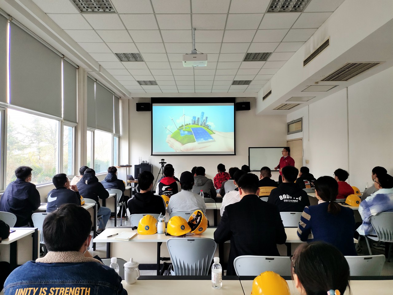 随后,高测光伏技术工程师高峰运用图文、视频向大家详细介绍了光伏领域发展行情、企业发展规模和生产运行方式。人力资源部经理臧彬彬向同学们开展了一场题为“恰少年,一起改变世界”的校园招聘宣讲,他从公司的主营业务、取得成就、发展前景和企业文化等方面对企业进行介绍,鼓励同学积极在就业过程中实现个人价值。宣讲过程中,同学们认真倾听,积极反馈,与企业负责人交流就业本领、薪资待遇、发展方向等与学生就业息息相关的问题。最后,机电师生走入生产流水线,进一步了解企业生产规模,感受制造行业的魅力。