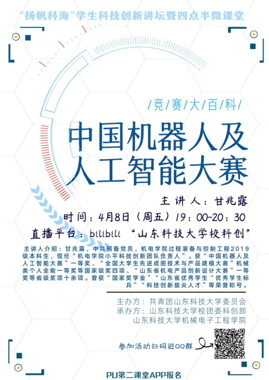 点击:为了激发同学们的科技创新热情,丰富相关专业知识和经验,4月8日晚上,hth华体育官网以直播形式举办“中国机器人及人工智能大赛”专题讲座。曾获得该赛事一等奖、小平科技创新团队负责人甘兆露担任主讲人。