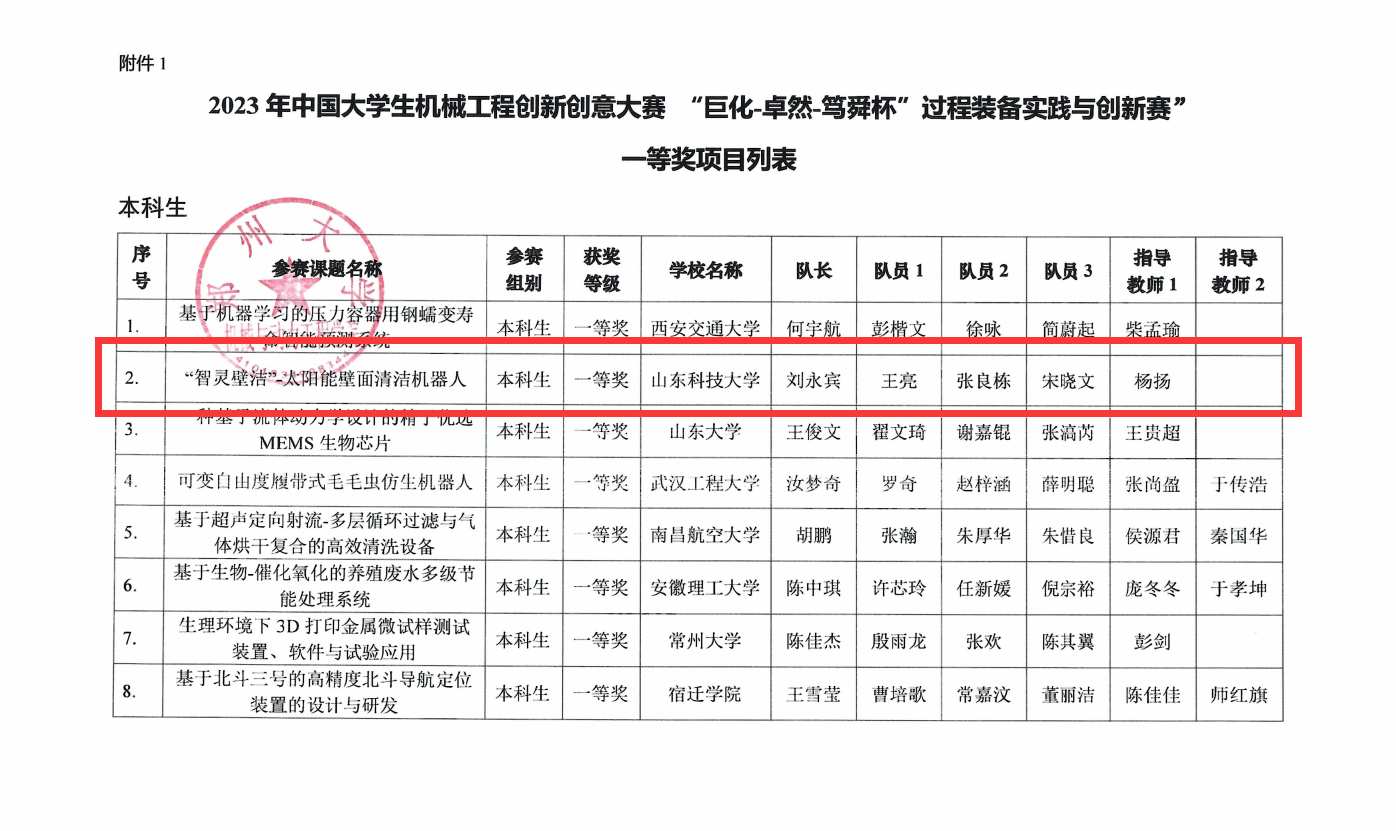 点击:8月26日,由中国机械工程学会主办,郑州大学承办的的中国大学生机械工程创新创意大赛系列赛事——“巨化-卓然-笃舜杯”过程装备实践与创新赛总决赛落下帷幕。经过激烈角逐,hth华体育官网学子斩获国家级一等奖1项、二等奖4项、三等奖2项,杨扬老师指导的项目《“智灵壁洁”-太阳能壁面清洁机器人》荣获国家一等奖。