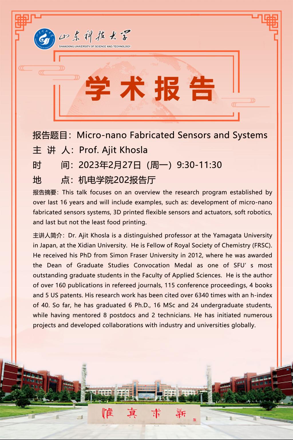 学术报告:Micro-nano Fabricated Sensors and Systems